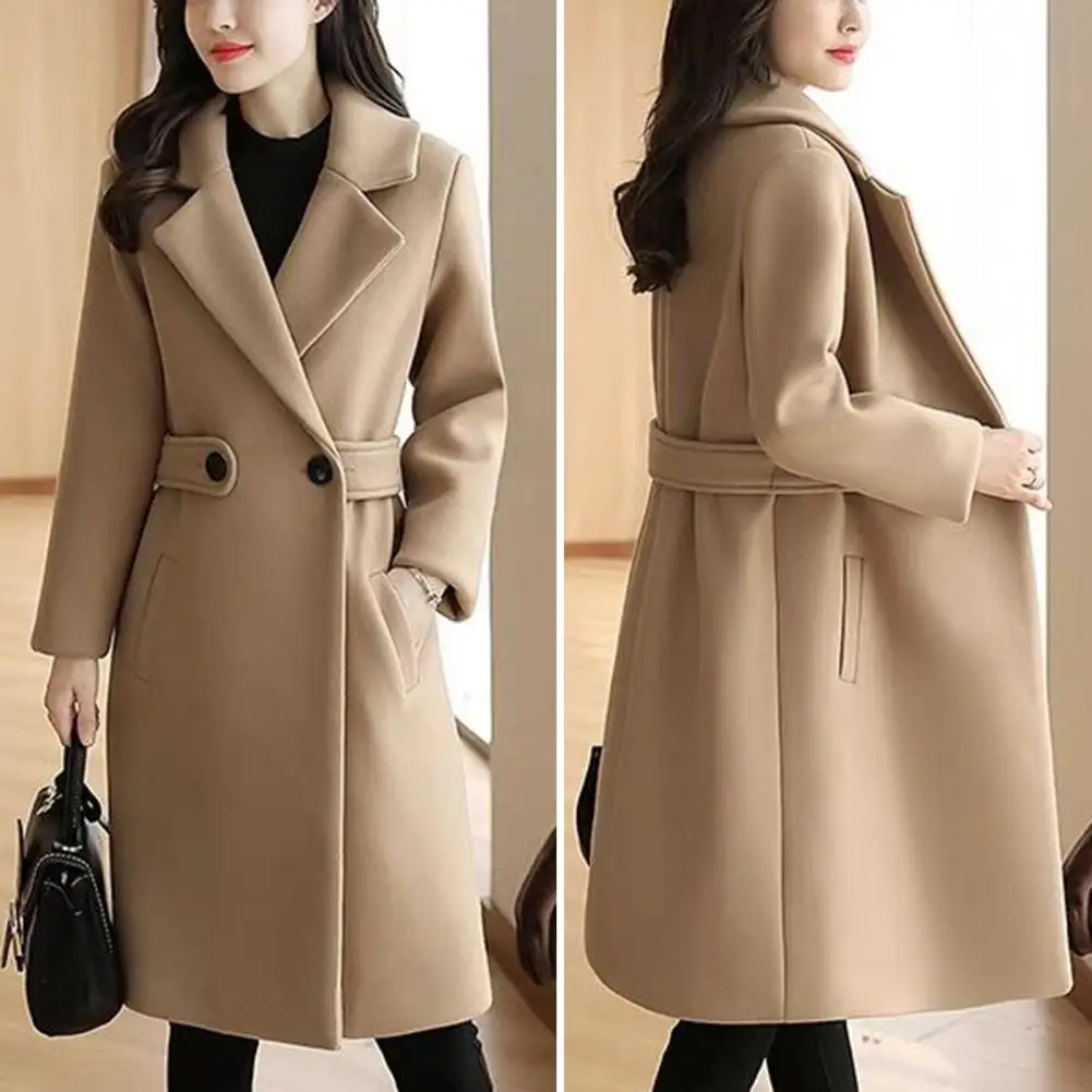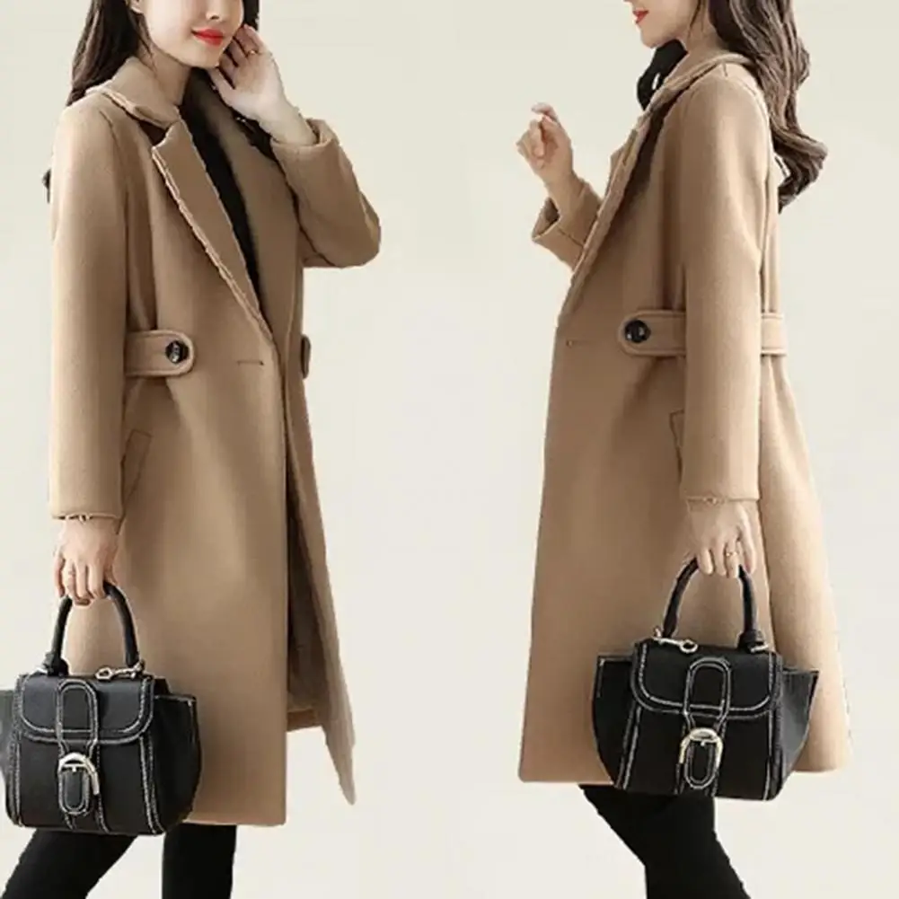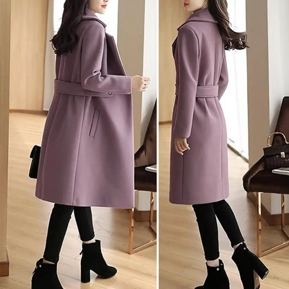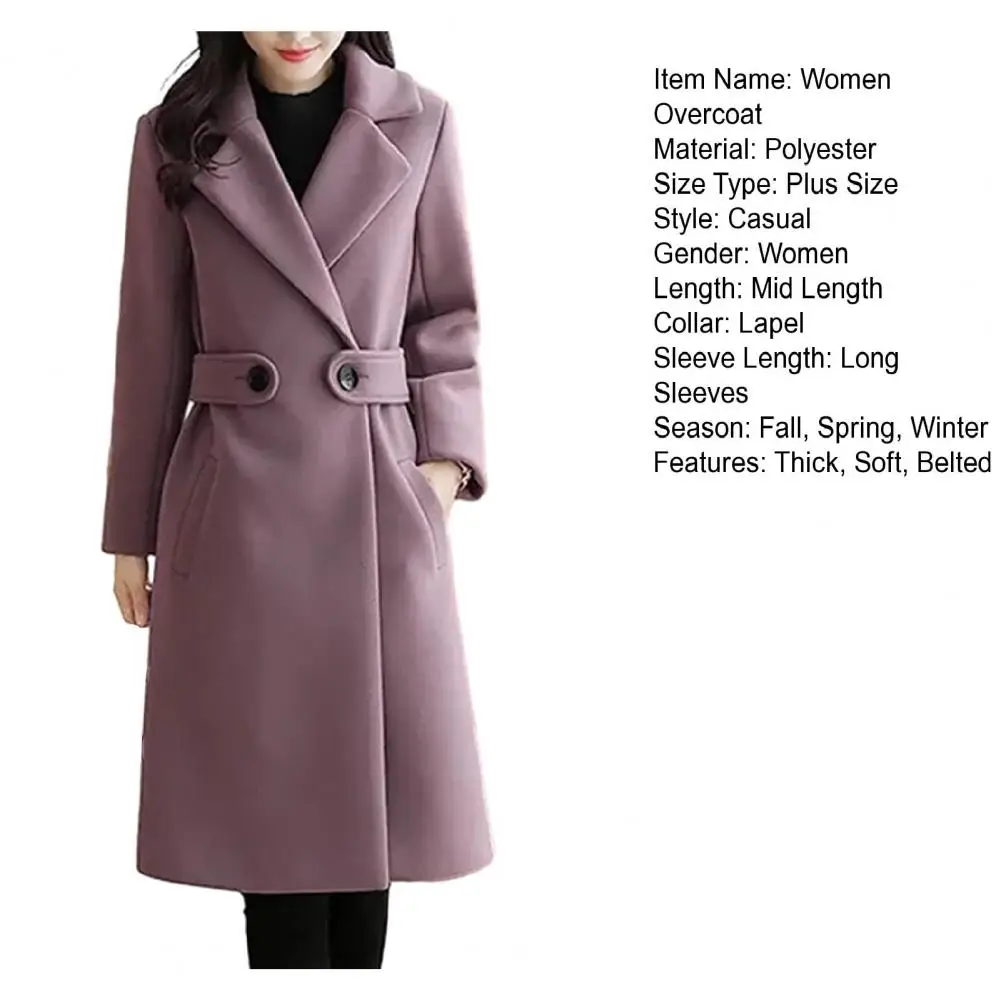 Fall Winter Women Overcoat Thick Solid Color Turn-down Collar Long Sleeve Cardigan Belted Button Closure Mid Length Loose Lady Coat