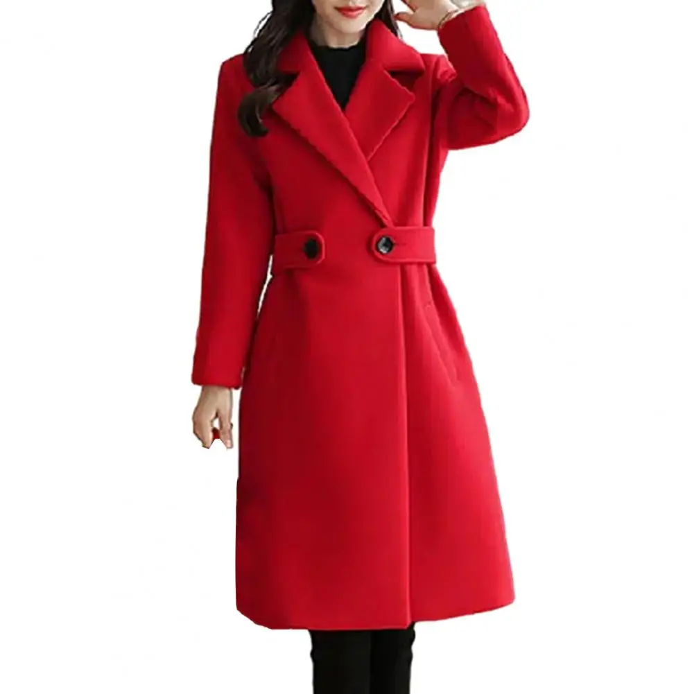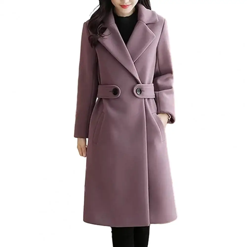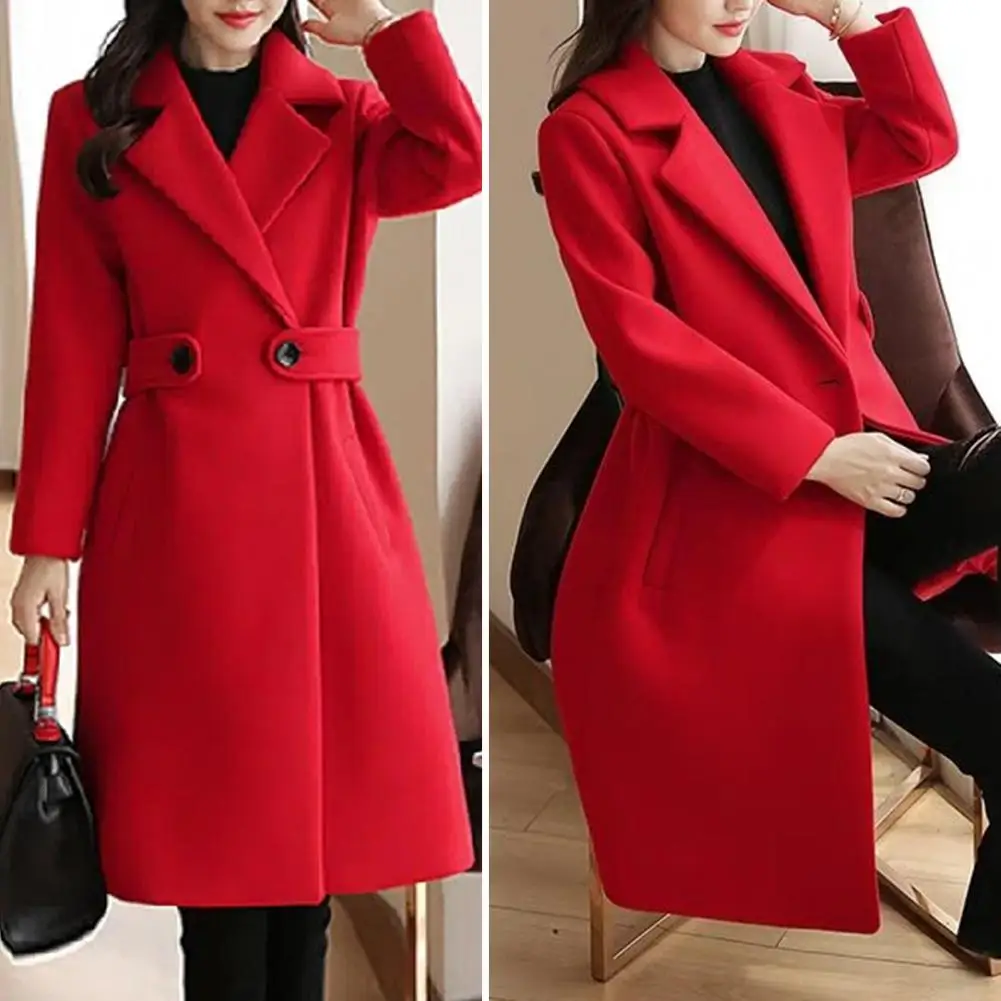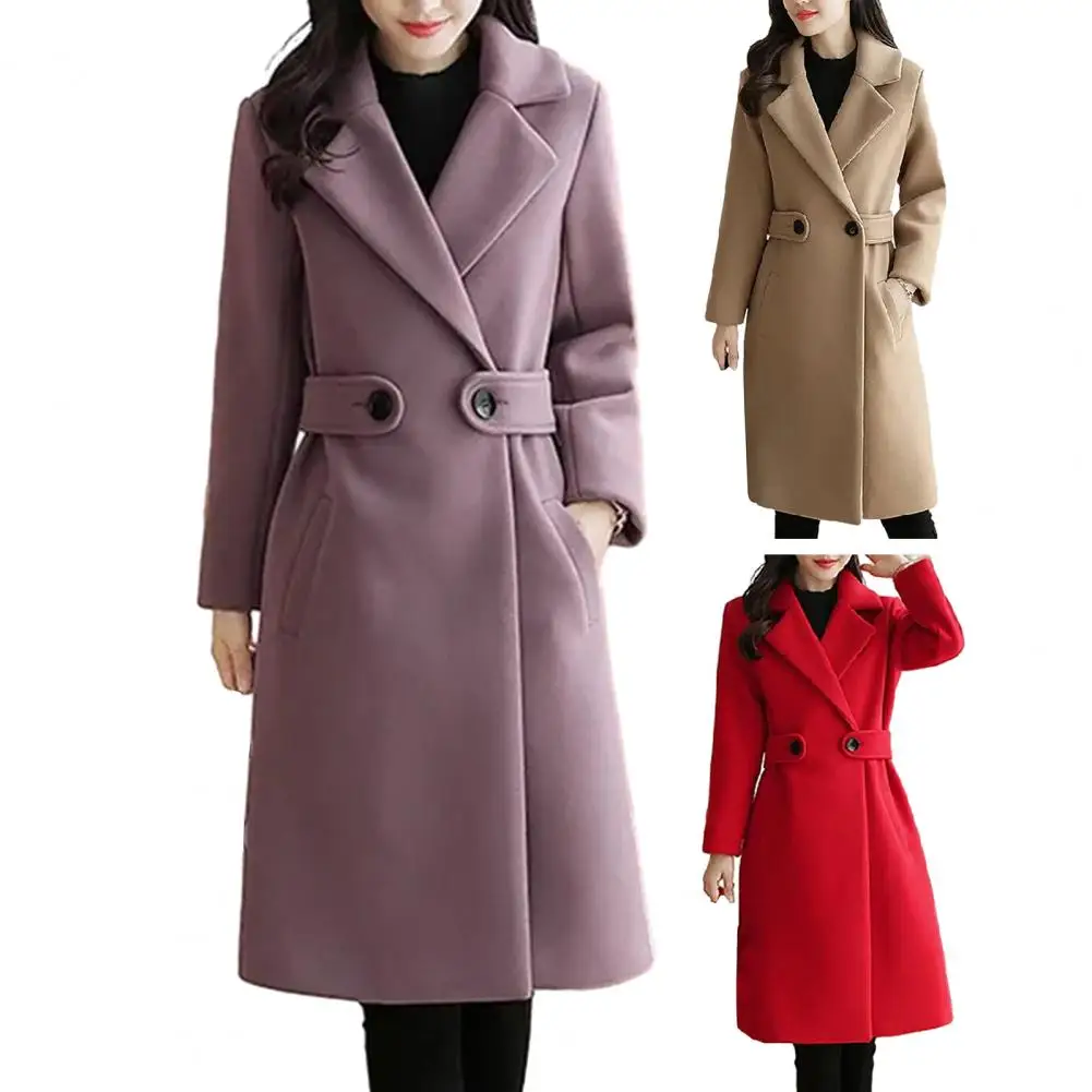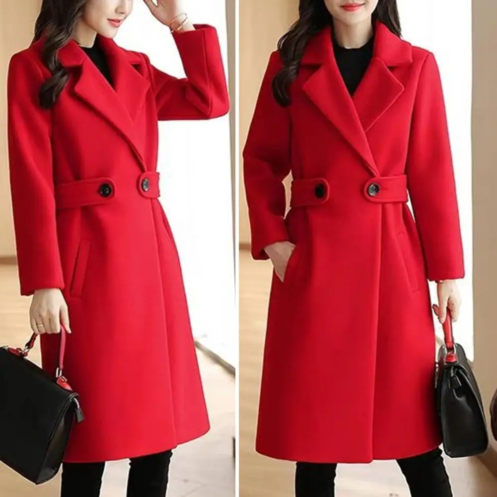 Fall Winter Women Overcoat Thick Solid Color Turn-down Collar Long Sleeve Cardigan Belted Button Closure Mid Length Loose Lady Coat