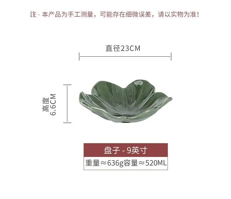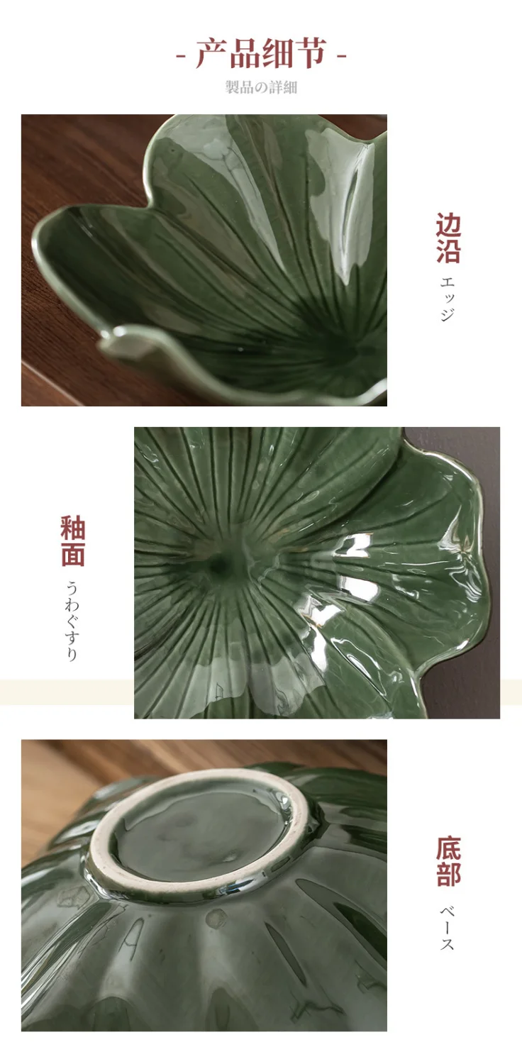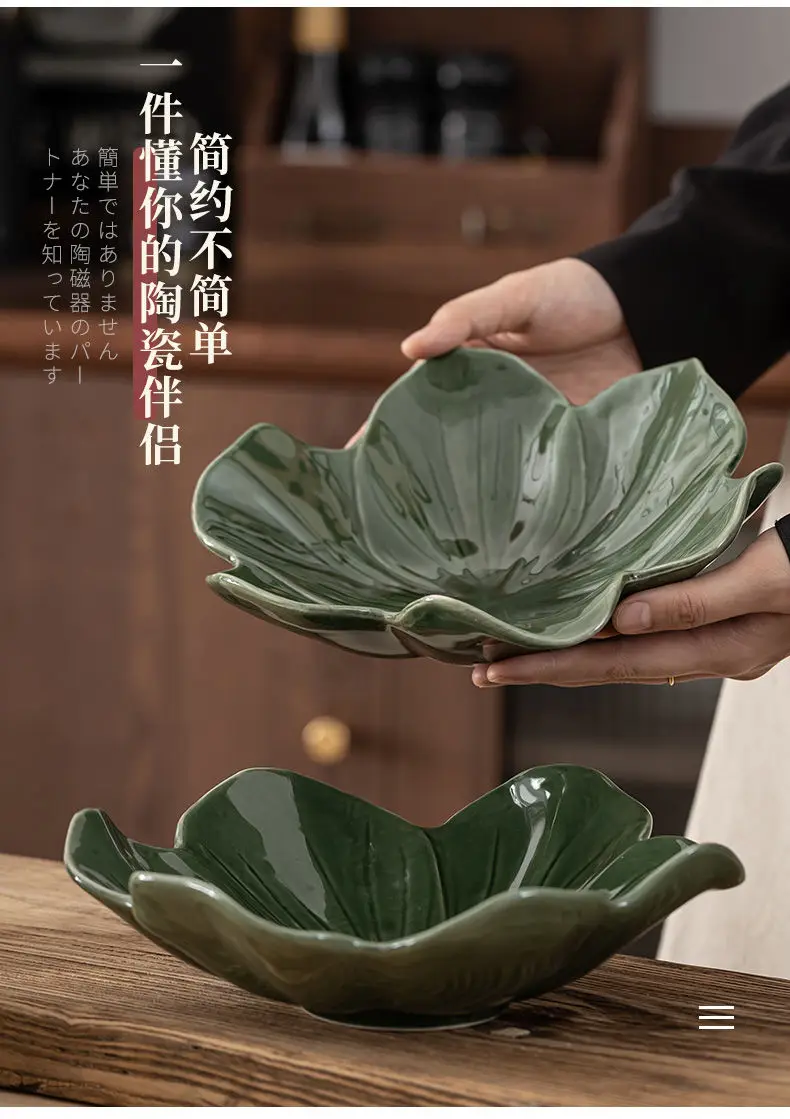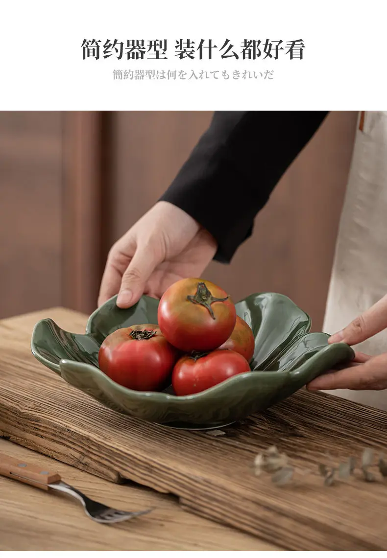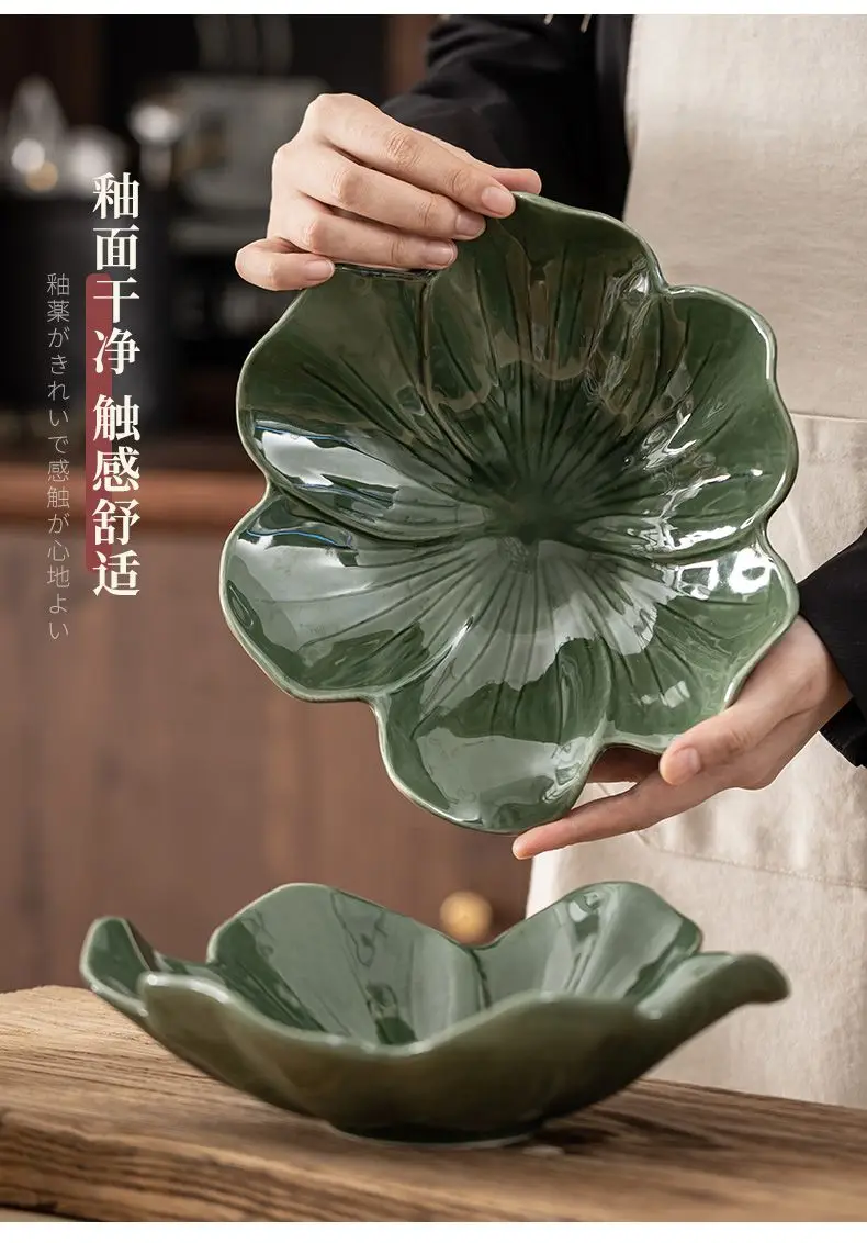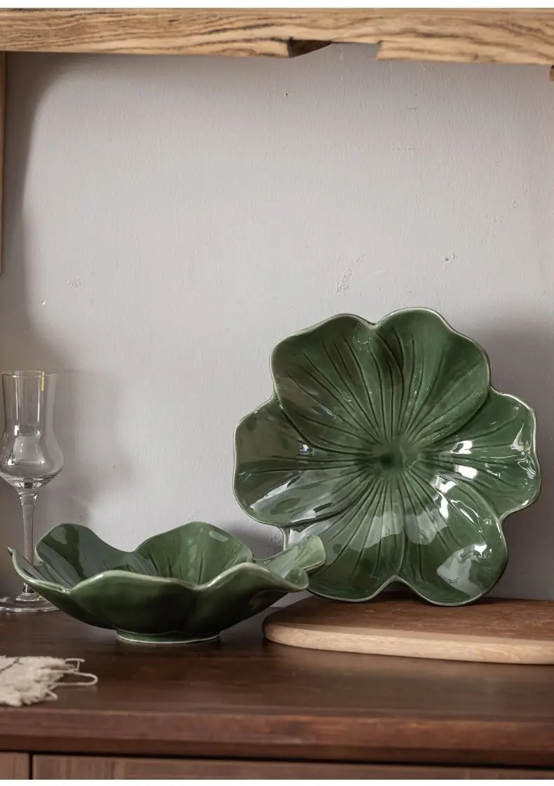 Vintage Style Dark Green Flower Plate,Large Capacity Ceramic Fruit Plate,Room Candy Plate,Restaurant Petal Shape Vegetable Plate
